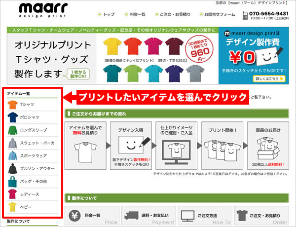 まずは、左メニューのアイテム一覧から、プリントしたい商品をお選びください。