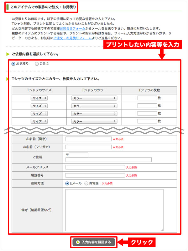 ボタンからプリント内容や指示をご入力いただき、お客様情報を送信してください。
